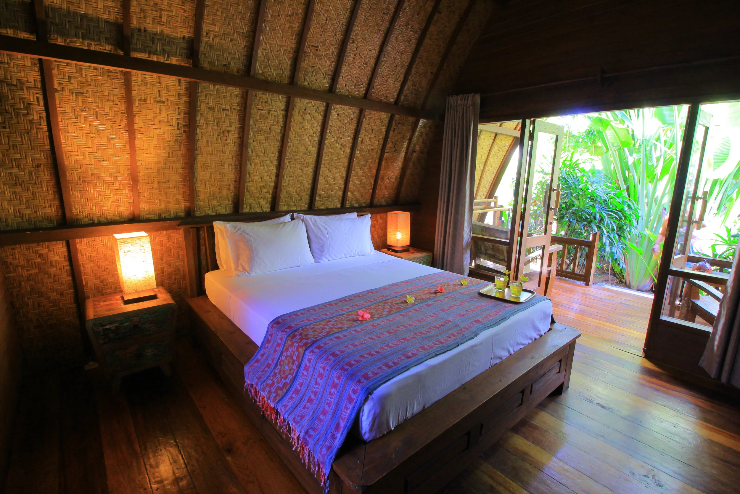 This style of bungalow is called a lumbung. There are four seperate, standalone lumbungs located on the property. All feature a private terrace with garden views. Each air-conditioned lumbung at Pantai Karang is equipped with a safe, small fridge and a flat-screen smart TV. The semi open bathroom is private and has both hot and cold fresh water. Towels are provided.